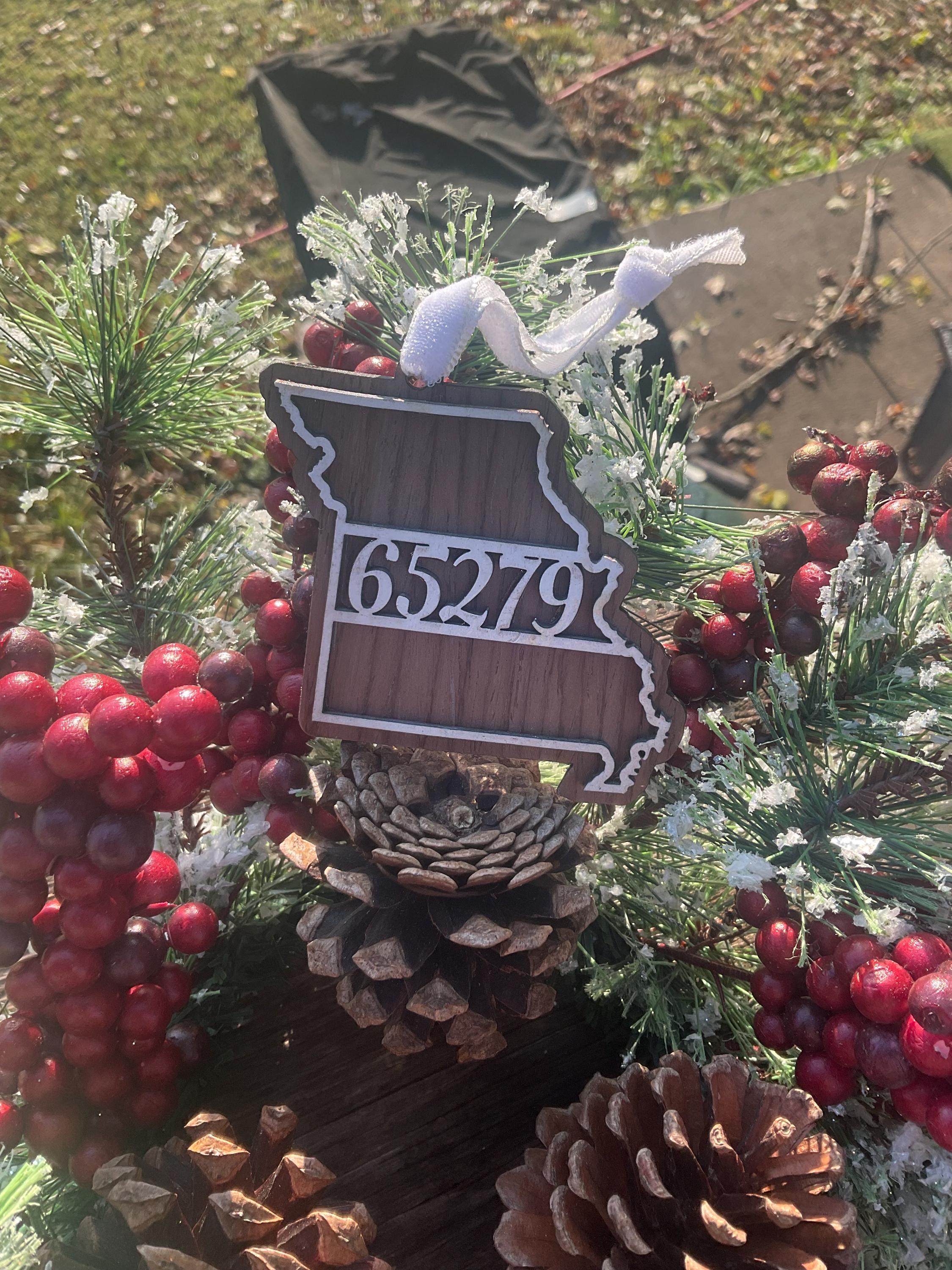 Personalized Missouri Ornament: Walnut Wood Zip Code Keepsake